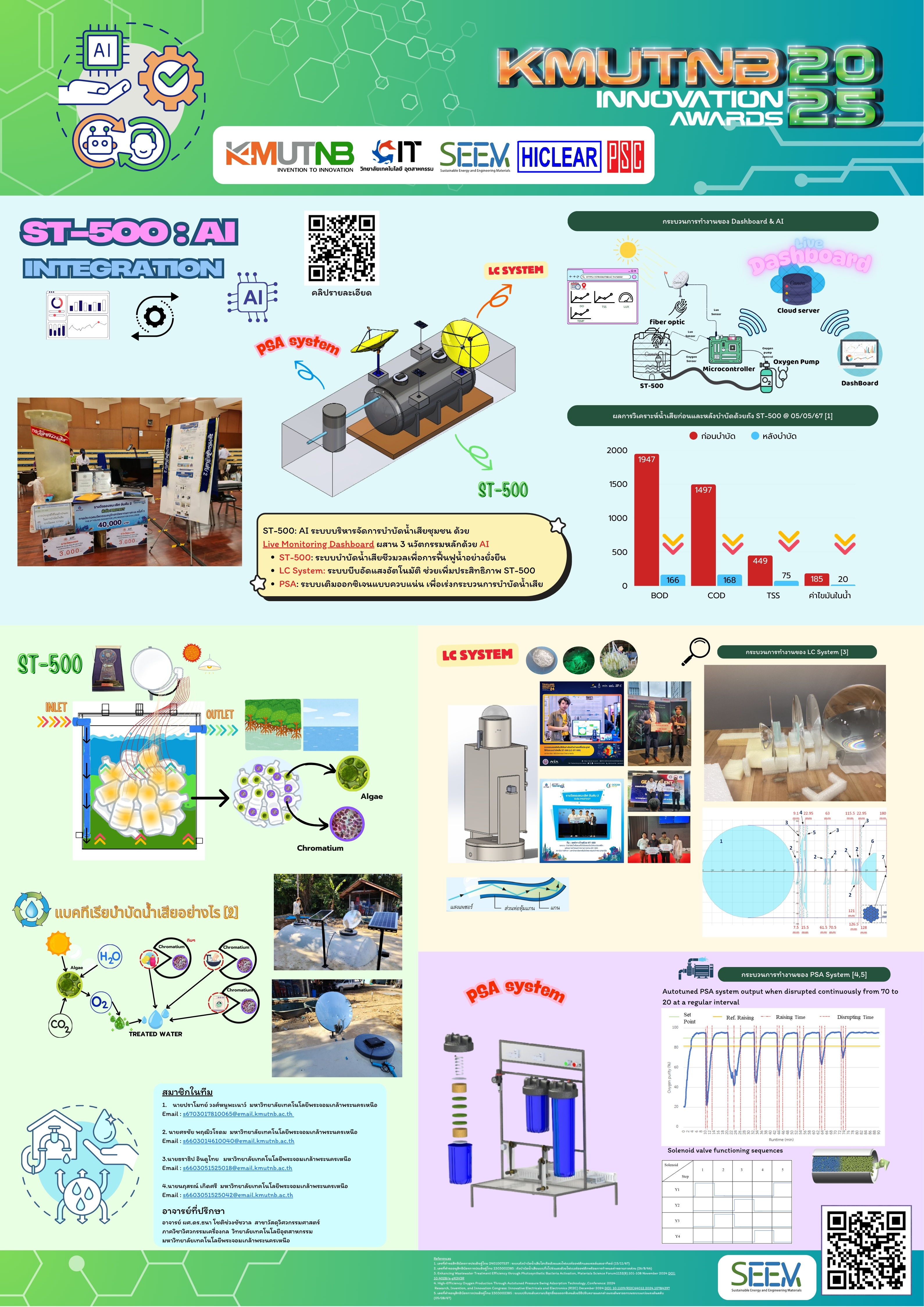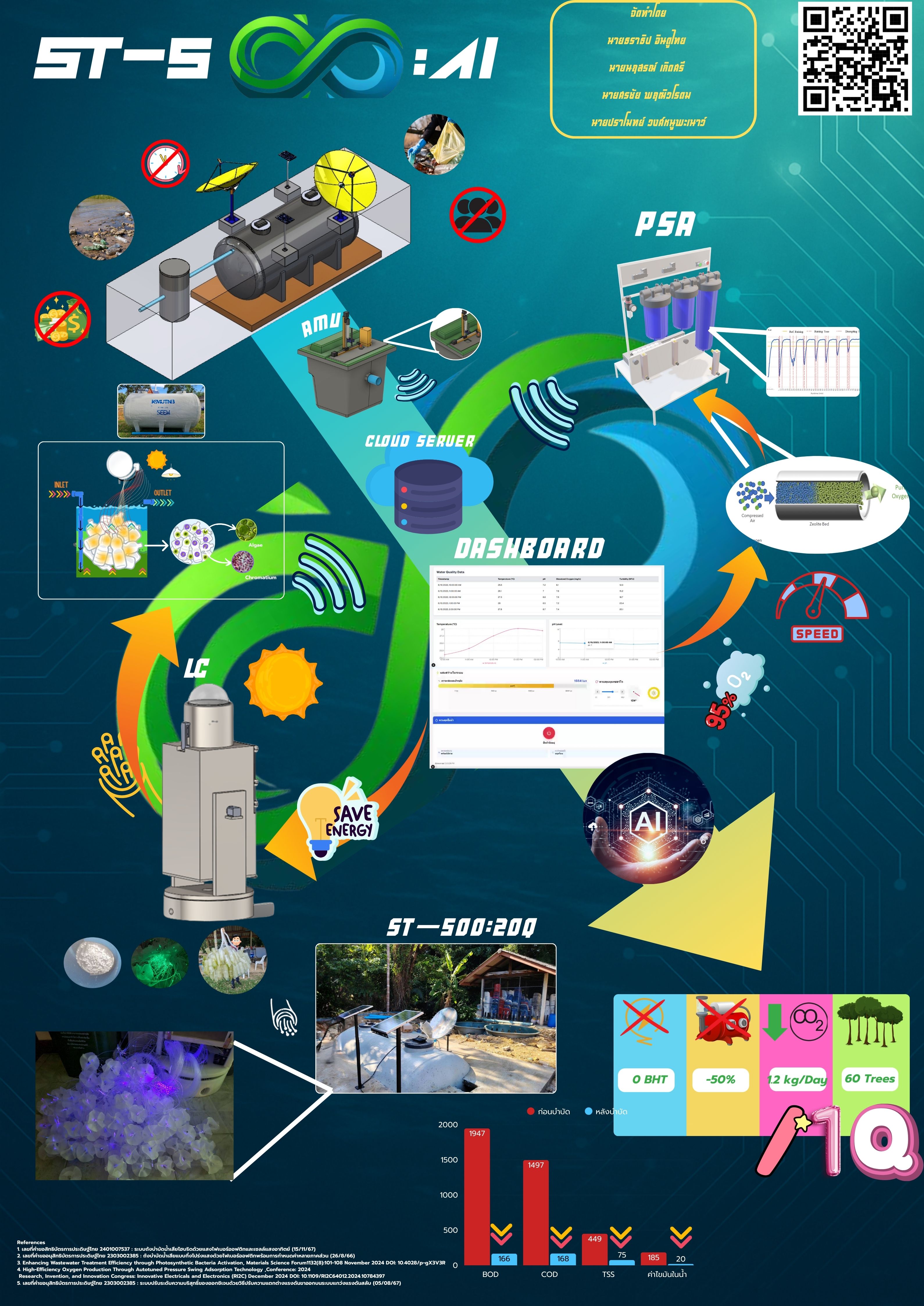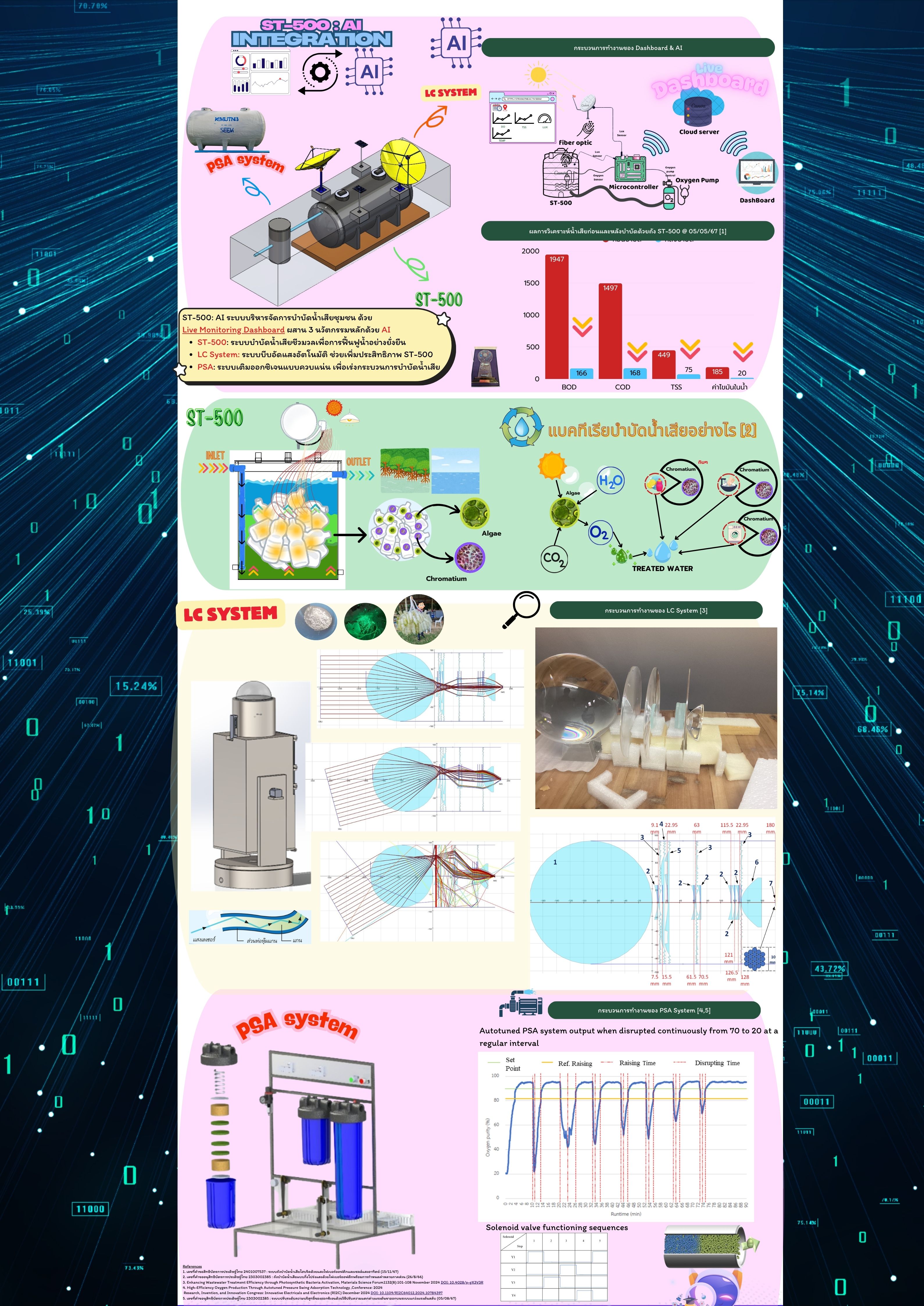 ระบบการจัดการน้ำเสียในชุมชนและธุรกิจท่องเที่ยวยังมีข้อจำกัดด้านประสิทธิภาพ ส่งผลให้เกิดมลพิษทางน้ำและกระทบต่อคุณภาพชีวิต ST-500: AI ระบบบำบัดน้ำอัจฉริยะและยั่งยืน จึงถูกพัฒนาเพื่อตอบโจทย์การบำบัดน้ำเสีย โดยบูรณาการ AI, IoT และระบบควบคุมอัตโนมัติ ร่วมกับ ST-500, Light Condenser (LC), PSA ระบบ ST-500 ซึ่งเป็นหัวใจหลักของนวัตกรรมนี้ อาศัย กระบวนการบำบัดชีวมวล โดยใช้ แบคทีเรีย Chromatium และสาหร่าย ในการย่อยสลายสารอินทรีย์ในน้ำเสีย อย่างไรก็ตาม การบำบัดทางชีวภาพต้องใช้ระยะเวลานาน ระบบ LC System จึงถูกนำมาใช้เสริม เพื่อควบคุมและเพิ่มความเข้มแสงผ่าน ไฟเบอร์ออปติกและแสง LED ช่วยเร่งกระบวนการสังเคราะห์แสงของจุลินทรีย์ ขณะที่ PSA System (Pressure Swing Adsorption) ถูกนำมาใช้เพื่อเติมออกซิเจนอย่างเหมาะสม ลดกลิ่น และเร่งกระบวนการบำบัด ทั้ง 3 ระบบทำงานร่วมกันผ่าน ระบบควบคุมอัตโนมัติ ที่สามารถตรวจสอบและจัดการผ่าน AI และ IoTs ทำให้สามารถเฝ้าระวังคุณภาพน้ำแบบเรียลไทม์ และปรับแต่งค่าการบำบัดได้อย่างแม่นยำ ช่วยลดต้นทุนพลังงาน เพิ่มประสิทธิภาพในการบำบัดน้ำเสีย และสนับสนุนแนวทางการพัฒนาอย่างยั่งยืน