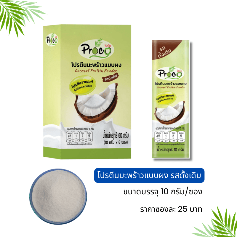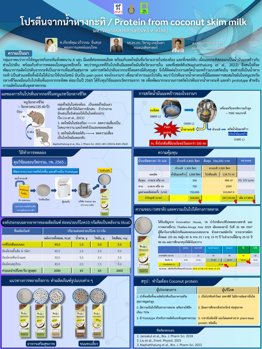 กลุ่มเราพบว่าการให้หนูแรทกินกะทิแห้งสดนาน 6 wks มีผลดีต่อหลอดเลือด พร้อมกับลดไขมันที่อวัยวะภายในช่องท้อง และที่เซลล์ตับ เมื่อแยกกะทิสดออกเป็นน้ำมันมะพร้าว กับส่วนโปรตีน พร้อมกับทำการทดลองในหนูแรทอีกครั้ง พบว่าหนูแรทที่กินโปรตีนมีผลลดไขมันที่อวัยวะภายใน และที่เซลล์ตับ (Naphatthalung et al., 2022) จึงสนใจที่จะพัฒนาการผลิตโปรตีนจากกะทิเป็นอาหารเสริมสุขภาพ ได้ติดต่อโรงงานสกัดน้ำมะพร้าวแบบสกัดเย็น ขอส่วนที่เป็นน้ำหางกะทิ ซึ่งเป็น pain point ของโรงงานฯ ที่ยังไม่ได้ใช้ประโยชน์มาทำการศึกษา ในปี 2565 ได้รับทุนวิจัยและนวัตกรรม จาก วช เพื่อพัฒนากระบวนการสกัดโปรตีน และทำเป็น prototype ในการผลิตโปรตีนจากน้ำหางกะทิแบบ organic ทำได้สำเร็จ และจดทรัพย์สินทางปัญญาเป็น “ความลับทางการค้า” ความคุ้มทุนในการผลิต จากน้ำกะทิสด 4.8 ตันได้น้ำมันมะพร้าว 1 ตัน มูลค่า 700,000 บาท กำไร 364,000 บาท น้ำหางกะทิสกัดโปรตีนได้ 134 กก มีมูลค่า 313,967 บาท กำไร 247,105 บาท ทดสอบความชอบและการตลาด อาสาสมัคร 105 คน, 80% ชอบรสชาติ และพร้อมที่จะซื้อผลิตภัณฑ์ซึ่งบรรจุซองขนาด 10 กรัม ราคา 25 บาท